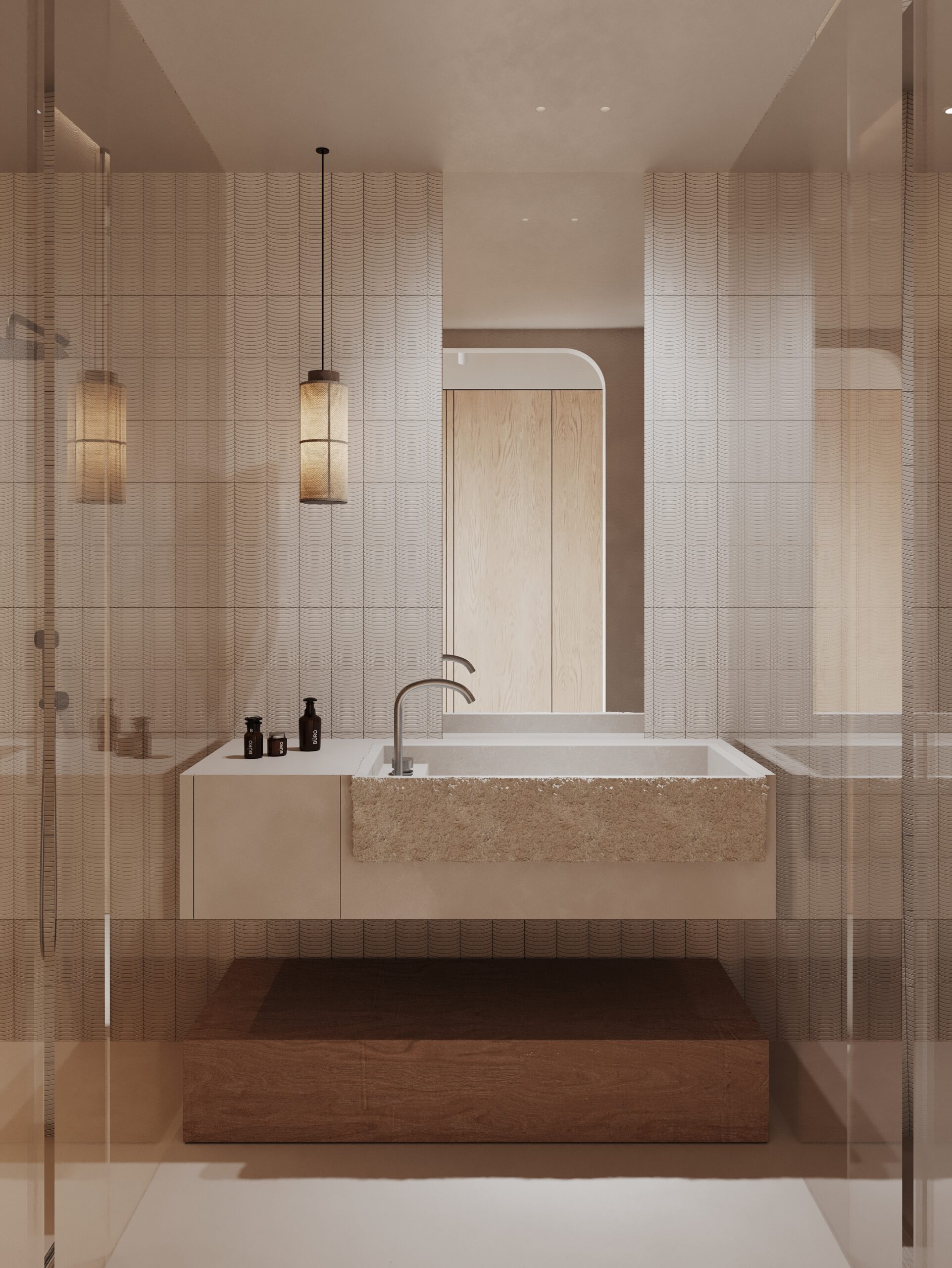 El bany de la suite ha estat dissenyat sota la filosofia de continuïtat i equilibri del projecte. Combina funcionalitat i puresa amb un acabat de ceràmica de forma orgànica que aporta un ambient net i relaxant, creant un espai agradable i serè que respon a les necessitats diàries sense perdre l’elegància i la coherència amb la resta de la reforma.