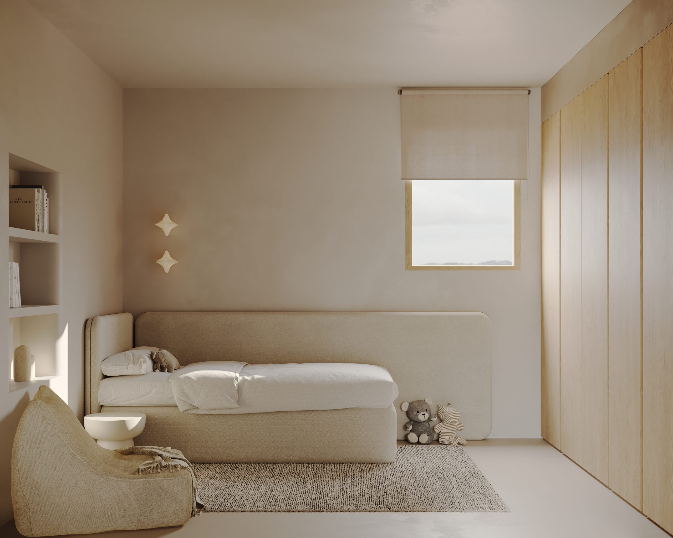 L’habitació juvenil s’ha dissenyat com un espai fresc i acollidor, creat per oferir confort i funcionalitat en aquesta etapa infantil, amb una zona de lectura i descans. Les solucions integrades permeten aprofitar al màxim l’espai disponible, alhora que garanteixen ordre i comoditat. Els acabats neutres de microciment i pintura de calç aporten continuïtat amb la resta del pis i creen un ambient serè i lluminós, deixant al mateix temps un teló de fons versàtil que permetrà que l’habitació s’adapti amb facilitat a noves etapes.